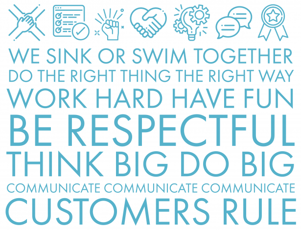 We live our values every day, because we know we sink or swim together. That means maintaining a high level of quality in our work and always striving to do the right thing the right way. Maintaining quality means we work hard but we have fun! Keeping the atmosphere fun encourages the positivity that helps us be respectful—of our clients, our work, and ourselves. Plus, positivity allows us the space to be creative so we can always think big and do big. But we know big ideas die on the vine if you don’t communicate, communicate, communicate! So, we collaborate and share ideas.